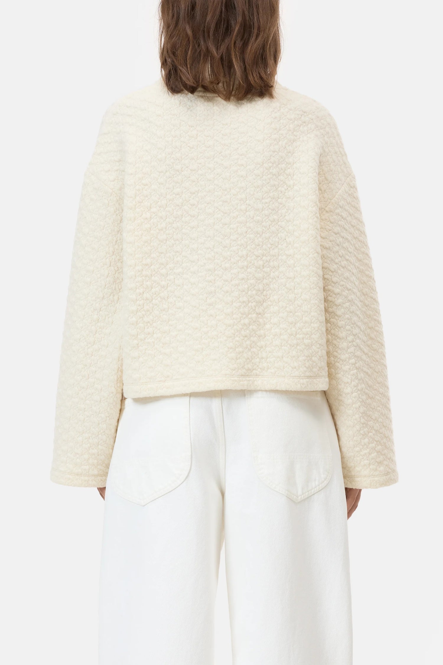 Dieses Sweatshirt mit hohem Kragen hat eine kastige, entspannte Passform mit cleanen Nähten und überschnittenen Schultern. Gefertigt aus italienischem Woll-Mix-Jersey in exklusiver Hahnentritt-Struktur. Hergestellt in Portugal.