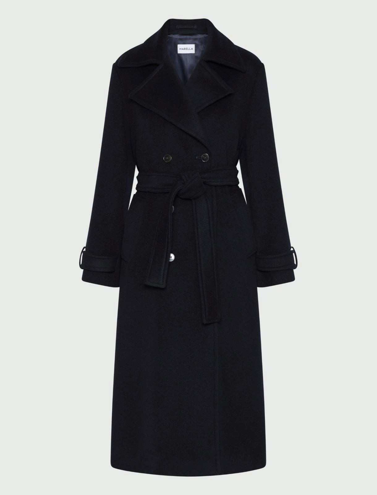 - Zweireihiger Verschluss mit sichtbaren Knöpfen und Gürtel